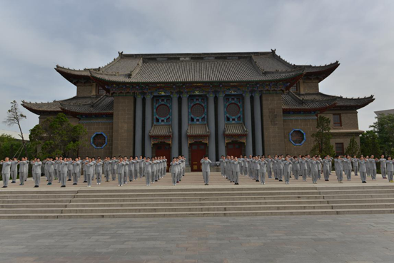 5月4日上午,来自全国27个省、直辖市的100余名太极武术高手身着统一太极练功服排列整齐,在百年学府河南大学大礼堂前展示了杨氏太极拳、陈式太极拳、长拳和自卫防身术的精髓要领动作,作为2014年第一期全国武术段位制指导员骨干培训班的结业成果展示。
