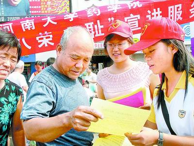 新华网河南频道8月8日讯 河南日报报道:8月6日上午,河南大学大学生“八荣八耻”宣讲服务团成员在开封市鼓楼广场向市民发放宣传材料。暑假期间,河南大学组成多支社会实践服务队奔赴全省城乡各地,宣讲社会主义荣辱观和新农村建设,并开展各种实践服务活动,受到群众的广泛称赞。