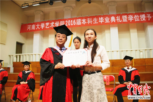 这是艺术学院在本科生毕业典礼上特意为她增加的一个环节,也是河南大学首次由院长在学位授予仪式上单独为旁听生颁发进修结业证书和校友证。