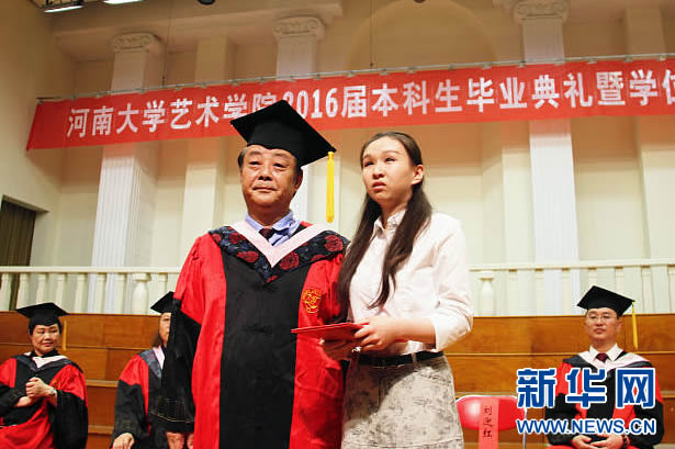 6月6日下午,在河南大学艺术学院2016届本科生毕业典礼暨学位授予仪式上,一位身着白衣花裙的盲人女孩儿在同学搀扶下缓缓走上台前,在400多位师生的共同见证下,河南大学艺术学院院长赵振乾为她颁发河南大学进修结业证和校友证。