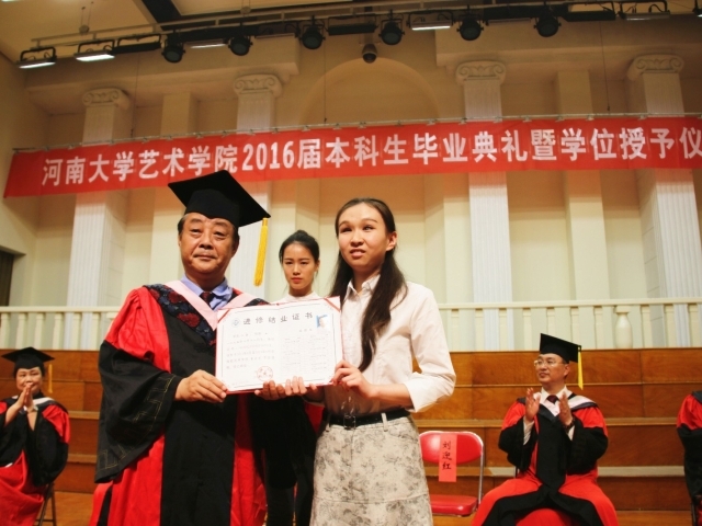 6月6日也是她“毕业”的日子。在400多位师生的共同见证下,河南大学艺术学院院长赵振乾代表河南大学,为这个双目失明的女孩儿颁发了河南大学进修结业证书和校友证。这是艺术学院在本科生毕业典礼上特意为她增加的一个环节,也是河南大学首次由院长在学位授予仪式上单独为旁听生颁发进修结业证书和校友证。