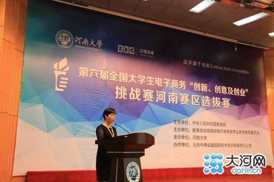 大河网讯 5月21日上午,由中华人民共和国教育部主管、教育部高等院校院校电子商务类专业教学指导委员会主办、河南大学承办的第六届全国大学生电子商务“创新、创意及创业”挑战赛河南赛区总决赛在河南大学金明校区开幕。中国信息经济学会电子商务专业委员会常务副主任、厦门大学教授彭丽芳,河南大学党委副书记王凌,河南大学党委宣传部部长李庆春、中诚博通国际技术培训有限公司董事长毛金明等领导及来自省内十三所高校的参赛队伍和专业指导老师参加了此次开幕式。开幕式由河南大学商学院院长王性玉主持。