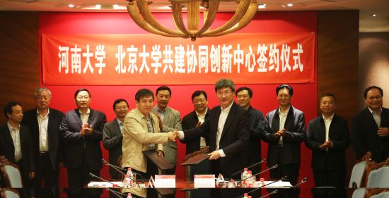 4月26日上午,河南大学与北京大学共建黄河文明协同创新中心签约仪式在北京大学英杰交流中心星光厅举行。教育部社会科学司司长张东刚、河南省副省长张广智、河南省委高校工委副书记、省教育厅副厅长、党组副书记张亚伟等领导出席,北京大学副校长高松,校长助理、社会科学部部长王博,河南大学党委书记关爱和、校长娄源功、副校长张宝明以及相关专家学者与会。签约仪式由河南大学校长娄源功主持。