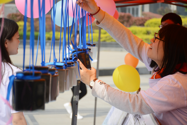 河南大学商学院的赵冬晴听到这声响,快步走到摊位前,看着悬挂的各式各样的风铃,惊叹“真漂亮呀”。她摇着同伴的胳膊,兴奋地说:“我们也自己动手做一个,挂在宿舍吧。这样不仅有意义,也参与了环保。”有趣的DIY深深抓住了学生的眼球,不同的主题展板前聚满了跃跃欲试的学生。