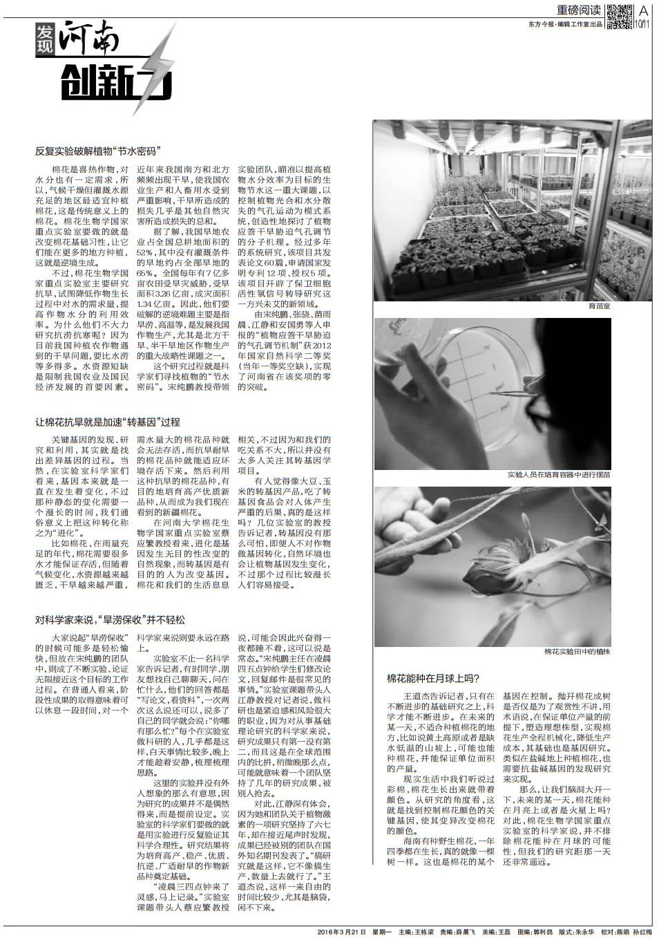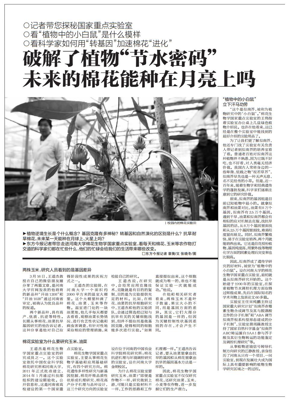 两个新品种,具有高产、优质、抗逆等特性。长期从事棉花、油菜抗旱基因研究的他告诉记者,这种分享是他对自己取得阶段性成果的庆祝方式之一。