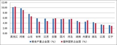 全国十三个粮食主产区粮食产量及播种面积占全国比重(2015)