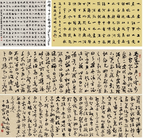 人到中年后才能深深地体悟到人生的意义、责任和问题,反省到人生的究竟。所以,才能更深潜下来。赵振乾已近花甲之年,携数十年的深厚学养和书道修为,艺术也臻于高峰。韶华虽去,然养令翮成,气韵、笔墨、虚实、阴阳、明暗自当不拘于一时一地的艺术表现,却融合贯通于古今的艺术理想,毫濡墨间,更有了一份与这无限的自然浑然融化为一体的豁达自在与从容;撇捺之间都向着无尽的宇宙作出无止境的奋勉,都充满着生命的律动。这是顺着自然法则的默契而潜存着一层深深的静寂,沉落于宇宙苍穹昴宿之中,意境旷渺而深遂。这时,他的书法成为一片空明中金刚不灭的淬火,理趣横溢,脱略形迹,纵横笔意,境与神会,由巧而返于拙,有法而归于无法,又归于有法之大成。这种大开大合,纵横捭阖,狂暴于笔端酣畅淋漓,无不充分表现了当代书法艺术的热情唯动主义的唯物思想。这因宁静中的动感激越悱恻,尤如阴霾沉郁后的暴风骤雨,痛快的重睹青天朗日。空气干净了,大地清新了,胸怀也从沉郁中恢复了光明愉快的超越。赵振乾在这宁静和雅的书法天地中,心胸里汹涌着情感的风浪、意欲着波涛,不谨于象似,不流于一俗,把和谐与秩序作为书法艺术的楷模,力求取法乎上,执中于善的极峰。这时,他沉浸在书法自由自在的一腔热血之中,成为表现主义的自由书性,成为当今书法艺术的先锋。这种狂热中的呼告,是他书法艺术丰富的乐章,回旋在他生命的漩涡里,奔赴在他的艺术人生里——灿烂如星辰,壮阔如彩虹。这种倥偬不矜不惧、刚健清新的气象,浑万象以冥观,兀同体于法度之外,每投笔如目无全牛,一刻也不停歇地渴求着对书法力量的美的追求,都发自凝想幽周,郎咏长川之中。