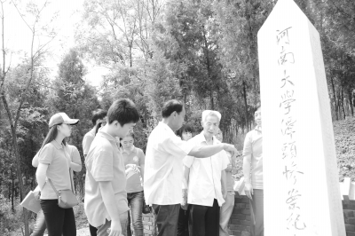 暑假,河南大学抗战流亡办学路线采访团来到了洛阳潭头镇。采访团成员在“潭头惨案”纪念碑前聚精会神地聆听村民安红兵讲解那段骇人听闻的历史。1944年,垂死挣扎的日寇向洛阳进军,5月15日入侵潭头,制造了骇人听闻的“潭头惨案”,河大师生及家属9人遇难。王宏宇 供图