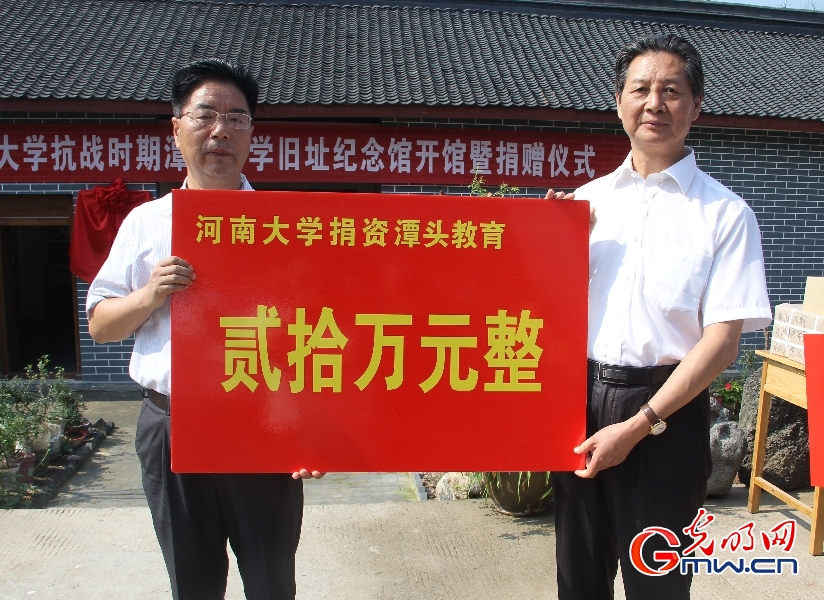 在开馆仪式中,校长娄源功代表河南大学向潭头教育捐资二十万元,河南大学出版社捐赠图书730余册。仪式结束后,娄源功在采访中表示,“潭头人民曾经在最困难的年代给予河南大学无私的帮助,悠悠岁月,抹不掉河大师生与潭头人民结下的深情厚谊,我们要饮水思源,回报民众。”