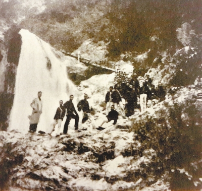 1941年4月,七七中学学生在老师张剑梅(左一,文学院学生)的带领下到重渡沟春游。七七中学由河大创办