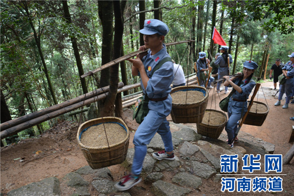新华网河南频道8月17日电 “小心,下雨路滑,大家都慢点”, 8月14日,在全国青少年井冈山革命传统教育基地现场教学点,14名来自河南大学民生学院的大学生学员上了一堂特色情景体验课——“红军的一天”。