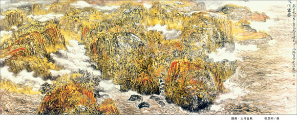 张卫和,北人南来。其画风,便能“南”“北”贯通。古“南画”以韵胜,笔上起“笔”,松秀圆润,有“无一笔不繁”之说。又以苔点破醒,总能达苍茫浑厚之效果。卫和画如是。古“北画”,方刚挺硬,笔上生“光”,重笔墨之“骨架”作用,有“无一笔不简”之说。又使线、面、中锋、侧锋相谐合表现,达壮丽清润之效果。卫和又如是。在取鉴“南画”“北画”中,卫和在不同程度上,将刚和柔两种画法,融化而能自抒己意。卫和大金碧山水,见点线中存古拙画风,更带有浪漫主义色彩,实境幻化为梦境之美,在无意中营造出一种恍惚迷离的神秘气氛,让画面生出许多奇异。再现那组成群峰山峦的金色线条,是构成表形达意的特殊方式。因为它的简捷、自由、造型语言在视觉功能上,带给读者更多明快之感。线条形成节奏和旋律上的变化,便能对物象形质以概括和抽象。卫和以金运墨,勾、皱、点、染、泼,给写意山水“穿上金装”。其用金,点线繁复,强调写意性和随意性,有一种“大江东去”之气派。