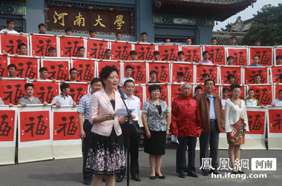 凤凰网河南频道讯 9月20日著名书法家柳国庆捐赠的一百幅榜书“福”字,在河南大学明伦校区校门一字排开,祝福河南大学百年华诞。河南大学校党委副书记王凌接收捐赠,仪式由河南大学党委宣传部副部长、新闻中心主任刘波主持。