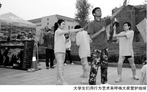 方阵外围,既有“亲,我们来种花”的号召行动,又有同学们表演的行为艺术《土壤荒漠化》。“没想到环保也可以时尚、新潮。”附近居民周艳说。