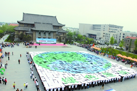 昨日上午,河南大学明伦校区大礼堂广场,集聚近2000名环保志愿者,他们身着标有环保宣言的统一文化衫,分成38列组成方阵,用手中的画板拼成巨型地球,画板翻转,则是一枚河南大学校徽。