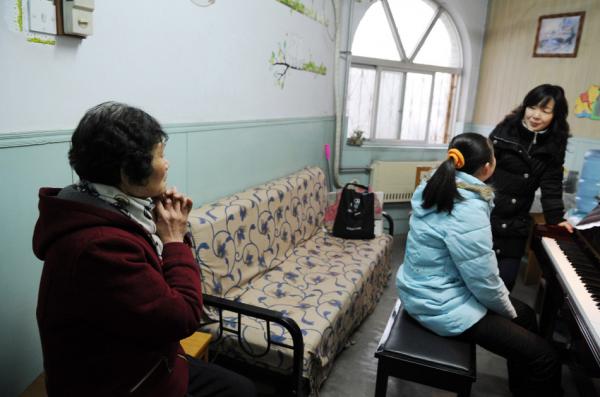 2012年3月21日,见到新钢琴老师后,代睿要给新老师弹奏钢琴了,奶奶紧张得将双手紧紧握在一起。