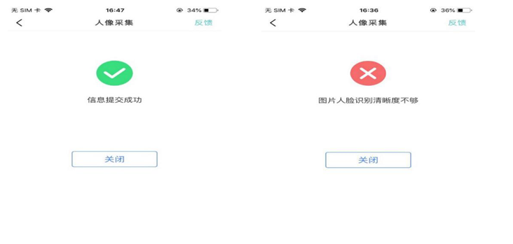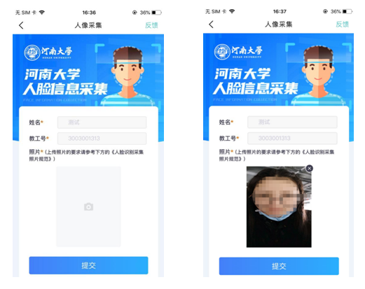 4、显示上传结果;如显示“未检测到人脸”,请上传显示您人脸的清晰照片;如显示“图片人脸识别清晰度不够”,请在光线充足的位置拍摄。照片可选择自拍也可选择上传,系统会自动检测照片是否符合人脸识别标准,如不符合会提示图片检测失败的原因。如有其它问题,请与信息中心人员联系,如照片库中没有照片将直接上传;如照片库中有照片,则会替换原照片,更新为您最新上传的照片。截图如下: