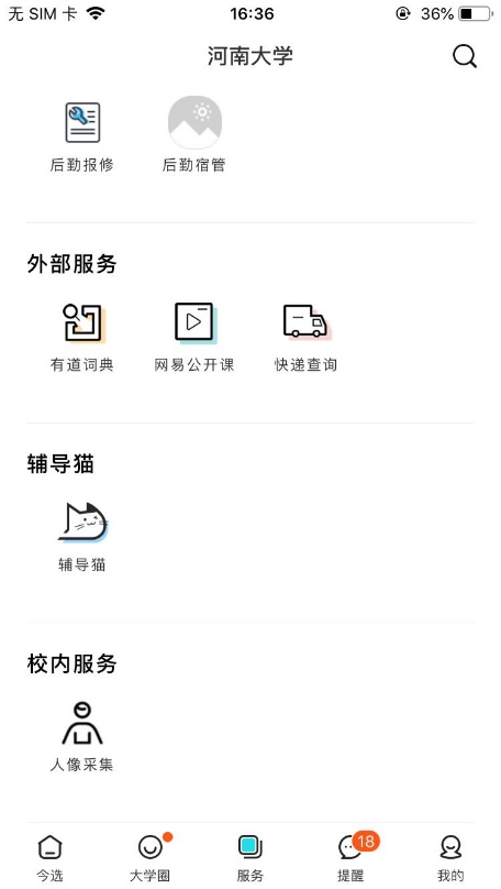 1、请登录“今日校园”APP,首次使用今日校园请参考附件1(今日校园初次安装使用说明)进行安装使用,点击下方的“服务”标签,滑动到最下方,找到“校内服务—人像采集”服务,截图如下: