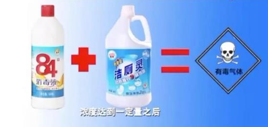 3、84消毒液和洁厕灵不能混用,否则产生有毒氯气,不仅导致消毒失效,还会毒害身体!