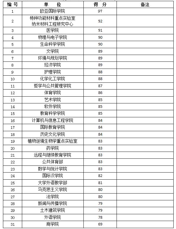 3月23日(周四)下午,校文明办和爱卫会组织人员对新、老校区各单位卫生区进行了全面的检查,现将各单位检查评分公布如下: