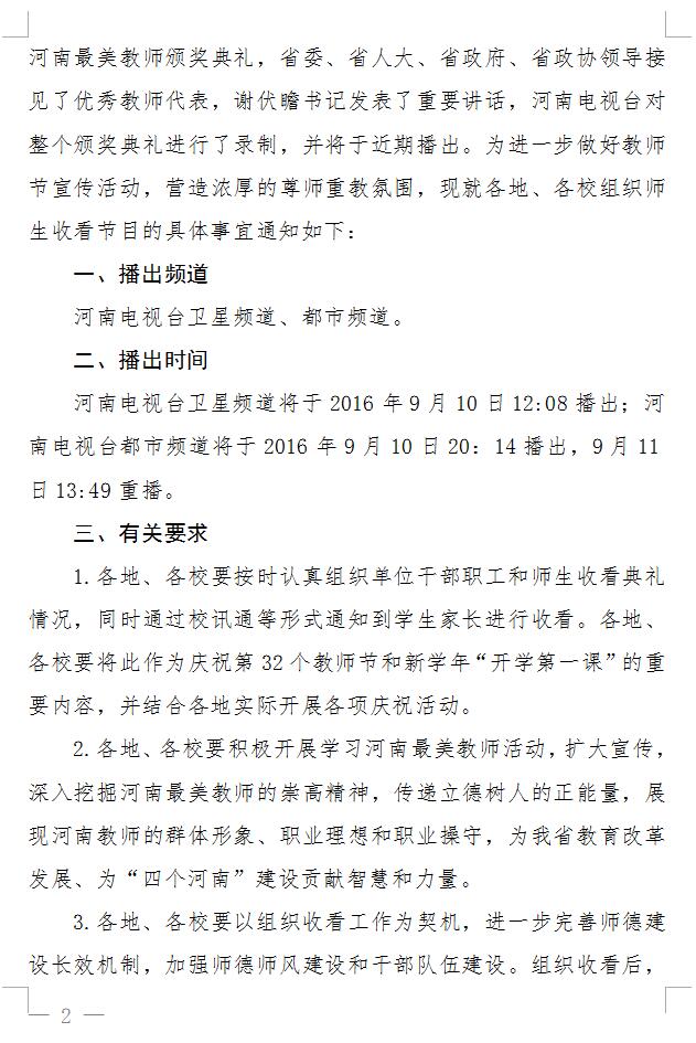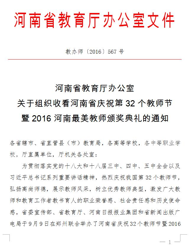 9月9日,河南省庆祝32个教师节暨2016河南最美教师颁奖典礼在郑州隆重举行,省委书记谢伏瞻发表了重要讲话,我校青年教师张晓辉获评2016河南最美教师荣誉称号,河南电视台对整个颁奖典礼进行了录制,并将于近日播出。河南省教育厅办公室下发通知,要求各地、各校要按时认真组织单位干部职工和师生收看典礼情况,同时通过校讯通等形式通知到学生家长进行收看。
