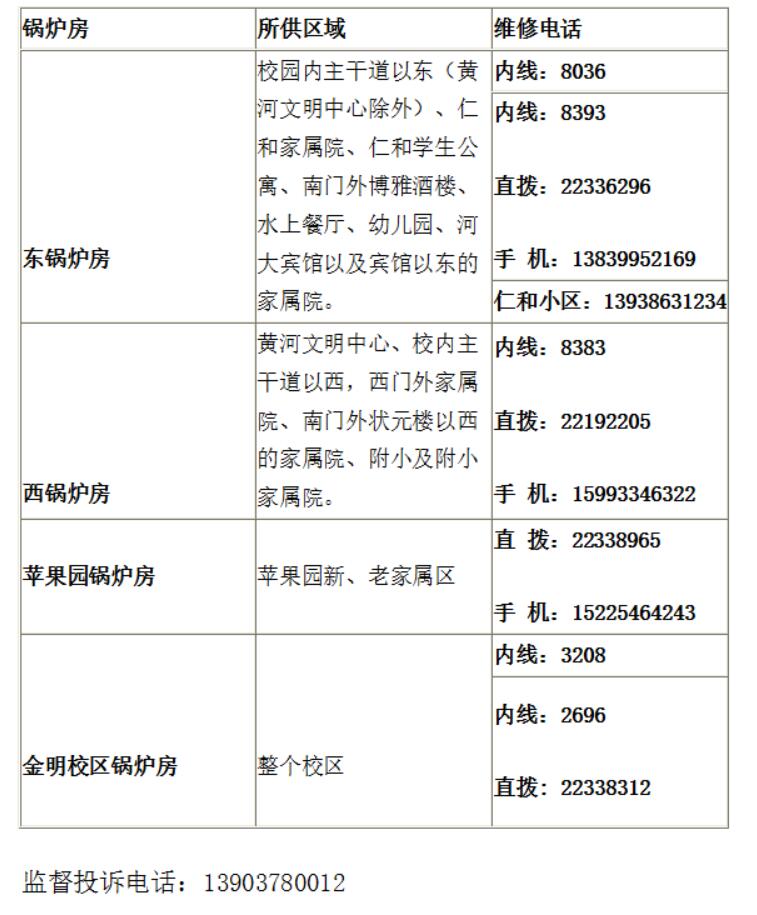2015—2016年度冬季采暖期已经临近,为保证学校和家属区供暖,根据学校安排对全校暖气管道进行供暖前试水、试压和管道冲洗,定于11月1日(周日)上午8时起进行暖气上水。请各办公室及住户家中务必留人,并对各自户内的暖气、管道、阀门等进行自检。此后的供水压力将保持到供暖结束,提醒您对室内供暖系统进行经常性的检查,避免因未及时发现问题而给您造成损失。如发现暖器有跑冒滴漏问题,请及时与各锅炉房值班联系。