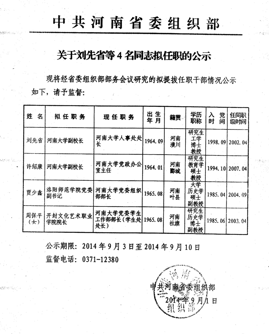 关于刘先省等4名同志拟任职的公示