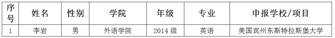 根据国家留学基金管理委员会有关规定,经学生报名、学院工作小组考核研究、校有关部门审核,拟推荐我校外语学院优秀本科生李岩参加2017年“国家留学基金管理委员会优秀本科生国际交流项目”,信息见下表: