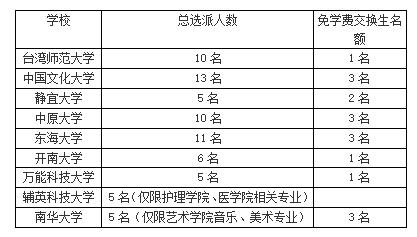 根据我校与台湾友好高校交流合作协议,学校拟选派优秀学生赴台湾相关高校研修学习(具体名额见下表)。学生在台学习期间,学费(免学费交换生除外)、食宿费等费用由学生个人承担,时间为2018年春季学期,所修课程学分转换参照我校学生学分转换有关规定执行。