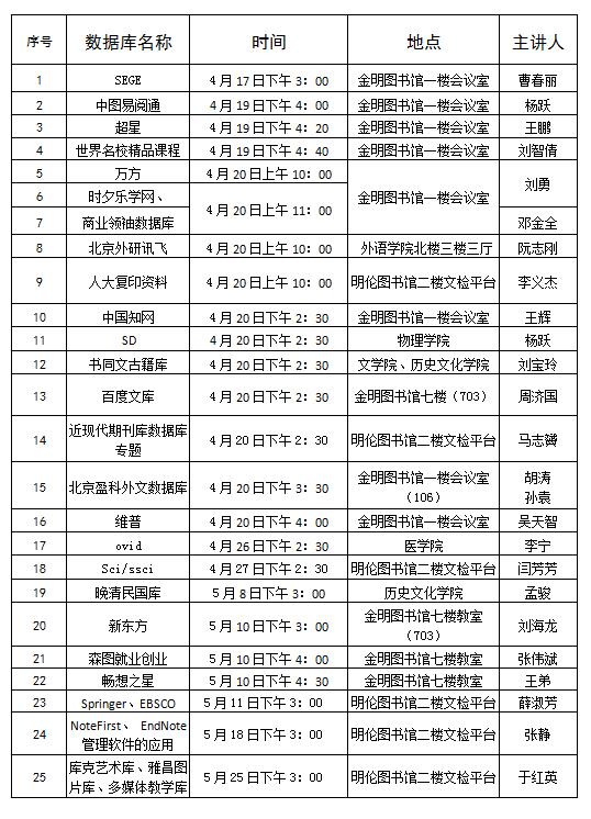 定于4月19日下午在金明校区图书馆一楼大厅举行2018读书月启动仪式及数字资源集中宣介活动。19日全天将邀请33家数据库公司现场咨询和宣传。读书月期间图书馆将组织20余场数字资源培训(培训日程安排附后)。敬请广大师生关注图书馆活动通知,积极参加培训活动。联系电话:23623277 23886471