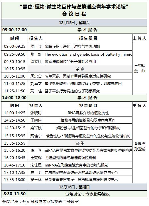 昆虫-植物-微生物互作与逆境适应研究在作物抗逆改良、生物多样性和病虫害绿色防控中发挥着重要作用,是国内外研究的前沿和热点,能为国家粮食安全和生态安全提供重要保障。为展示相关研究方向的最新科研成果,共商领域发展前景,加强青年学者之间的交流与合作,由中国昆虫学会青年工作委员会主办,河南大学生命科学学院和植物逆境重点实验室协办的“昆虫-植物-微生物互作与逆境适应青年学术论坛”将于2018年12月15-16日召开,诚挚欢迎老师、同学参加。会议日程如下: