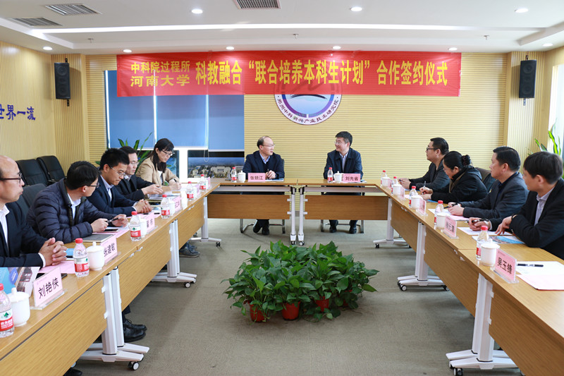 4月11日下午,河南大学与中国科学院过程工程研究所科教融合“联合培养本科生计划”(简称“菁英班”)合作签约仪式在过程所郑州分所(郑州中科新兴产业技术研究院)举行。校党委常委、副校长刘先省,中国科学院院士、过程工程研究所所长张锁江、郑州分所班子成员,我校化学化工学院有关负责人出席签字仪式。