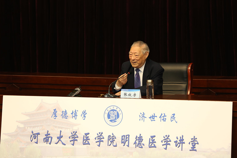 张效房从1939年以全国第一名的成绩考入河南大学医学院说起,介绍了河南大学在抗日硝烟中坚持流亡办学的历程,讲述了当时河大学子在极其艰苦的条件下,怀揣着身边同学被日寇杀害的悲愤和国破家亡的满腔愤慨,凭借一颗赤诚的爱国之心,坚持奋发学习的故事。建国之后,在党和国家的关心和支持下,张效房带领团队广泛调研、刻苦钻研、大胆创新,先后为全国消灭沙眼致盲做出了突出贡献、开创了“眼内异物定位摘出法”和“小切口非超声乳化白内障摘出术”国际先进的眼科手术方法。他通过自己的从医经历来勉励师生,在今后的学习和工作中一定要有严谨细致的科学态度和关爱病人的人文精神,更好地服务人民群众,不辜负党、国家和学校的教育。张效房的讲述把现场师生带入到那个烽火连天、艰苦创业的时代,与会师生无不为之动容。