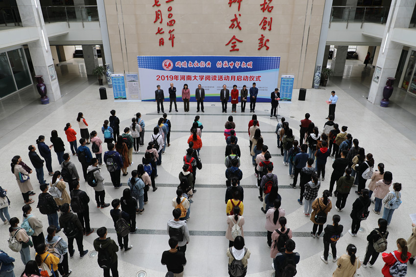 人间四月芳菲天,春风做伴好读书。4月19日上午,由校党委宣传部、学生处、离退休工作处、校工会、校团委、出版社和图书馆共同主办,2019年“阅读文化经典,传承中华文明”河南大学阅读活动月启动仪式在金明校区图书馆一楼大厅举行。书评学社和宋韵诗文学社等学生团体、图书馆和有关学院教师代表参加仪式。仪式由图书馆副馆长吉宇宽主持。