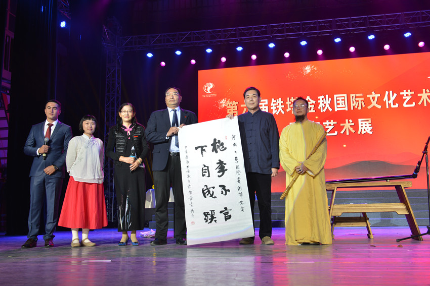 除了留学生们的精彩表演,还有由河南大学国际汉学院老师及国际学生实践基地的指导教师带来的琴箫合奏《阳关三叠》。两位老师琴箫和鸣,轻弹慢拨,萧声渐响,婉转悠扬。与此同时,国际学生实践基地的另一位老师在舞台另一边挥毫泼墨。曲终,老师们向在场观众展示了这幅书法作品——“桃李不言,下自成蹊”。该作品现场赠与河南大学,由河南大学副校长孙君健代表受赠。