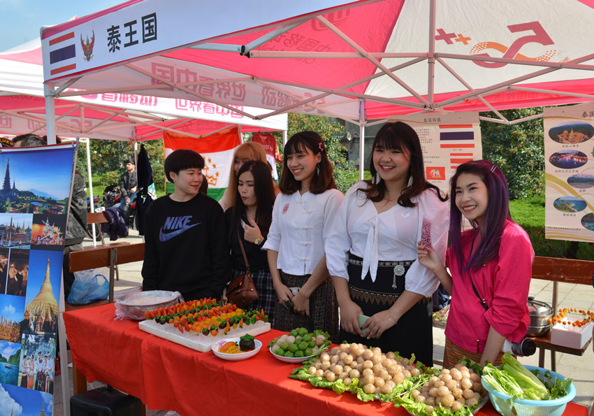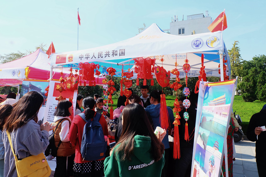 各国服饰大放异彩,各种美食调动味蕾。10:30,大礼堂广场前国家风情展展位已然就绪。留学生们通过海报展板、服装实物、游戏活动、美食百汇、舞蹈表演等形式展示自己国家或民族的独特文化和风土人情,吸引许多人驻足旁观。