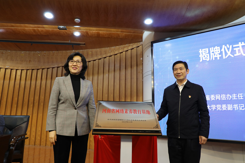 河南省委网信办主任郭岩松、校党委副书记雷霆为河南省网络素养教育基地揭牌