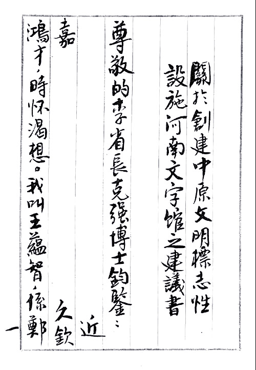王蕴智向河南省时任省长李克强寄呈《关于创建中原文明的标志性设施——河南文字馆之建议书》之首页