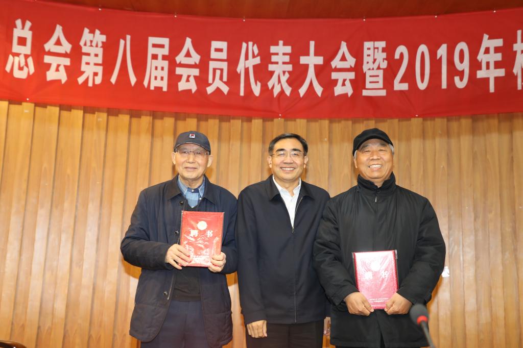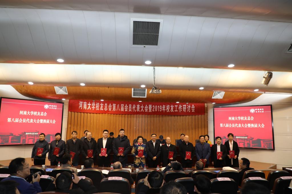 校长、校友总会第八届理事会会长宋纯鹏为河南大学原校长王文金、原党委书记孙培新颁发顾问聘书;为西藏校友会会长喜乐等12名第八届理事会理事代表颁发聘书。