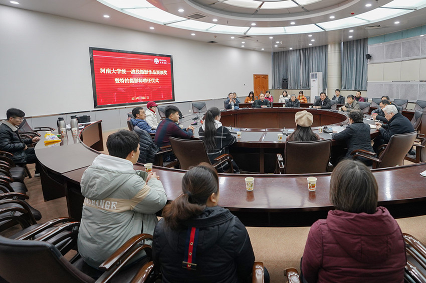 2019年12月27日,我校统一战线摄影作品展颁奖暨特约摄影师聘任仪式在金明校区行政楼152会议室举行。仪式上对统一战线“喜迎新中国成立70周年摄影展”获奖者进行了表彰,并为获奖者颁发了“河南大学统一战线特约摄影师”聘书。