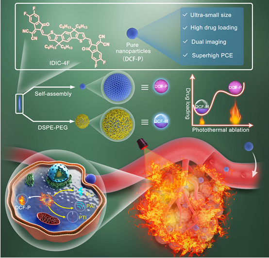 基于上述理念,基础医学院纳米医学光子学实验室科研人员以共轭有机小分子IDIC-4F为研究对象,通过自组装和纳米沉淀法,制备了仅含有IDIC-4F的超小纳米粒子DCF-P和IDIC-4F@DSPE-PEG2000纳米粒子DCF-M。包载率测试显示DCF-P纳米粒子中IDIC-4F含量较DCF-M提高了15倍。X-射线衍射结果表明,IDIC-4F在DCF-P纳米粒子中高度有序排列,其可显著影响纳米粒子光热性能,DCF-P的光热转换效率高达80.5%,较DCF-M提高了40%。激光照射下,DCF-P对人非小细胞肺癌细胞A549具有优异的增殖抑制作用,其半数抑制浓度较DCF-M降低了39%。体内抗肿瘤性能研究表明,DCF-P具有较优异的肿瘤生长抑制性能和良好生物兼容性。分子作用机制研究揭示,DCF-P主要引发了肿瘤细胞的凋亡和坏死,进而抑制了肿瘤增殖。该研究发现了一类高包载率光热转换剂制备方法,验证了无载体包裹纳米粒子高效光热诊疗性能,证明了分子高度有序排列可显著影响其光热性能的新理念,提供了调控光热转换剂性能的新策略。相关研究结果以《Carrier-Free Delivery of Ultra-small π-Conjugated Oligomer Nanoparticles with Photothermal Conversion over 80% for Cancer Theranostics》为题发表于国际著名期刊Small (2021, DOI: 10.1002/smll.202104521, IF = 13.3)。