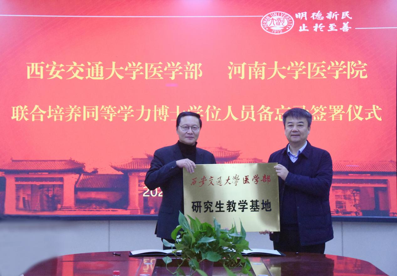为进一步提升我校医学高层次人才培养质量,助推新医科建设,12月11日,西安交通大学医学部与河南大学医学院首届联合培养博士学位开班仪式在学校金明校区曾宪梓楼二楼会议室举办。西安交通大学医学部人才培养处处长、博士生导师张明教授,博士生导师刘恩岐教授、杨筱凤教授、杨爱民教授、马吉光教授、人才培养处主管张耀丹老师,河南大学党委常委、副校长许绍康,医学院及所属单位主管人才培养工作领导参加会议。会议由医学院党委副书记王莹主持。