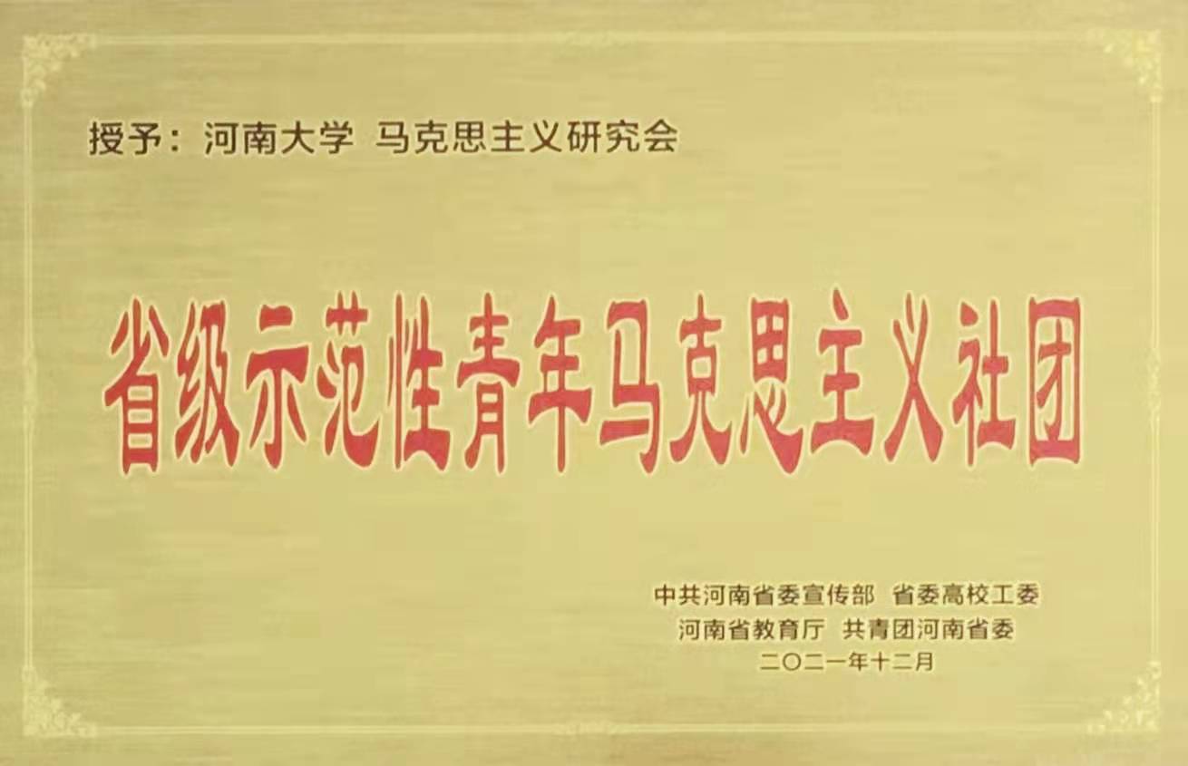 按照省委宣传部、省委高校工委、省教育厅、团省委《关于加强高校青年马克思主义社团的建设实施意见》和《关于组织开展河南省示范性青年马克思主义社团评选的通知》要求,经过资格审核、专家评审,挂靠在文学院的马克思主义研究会突出重围,荣获“省级示范性青年马克思主义社团”称号。