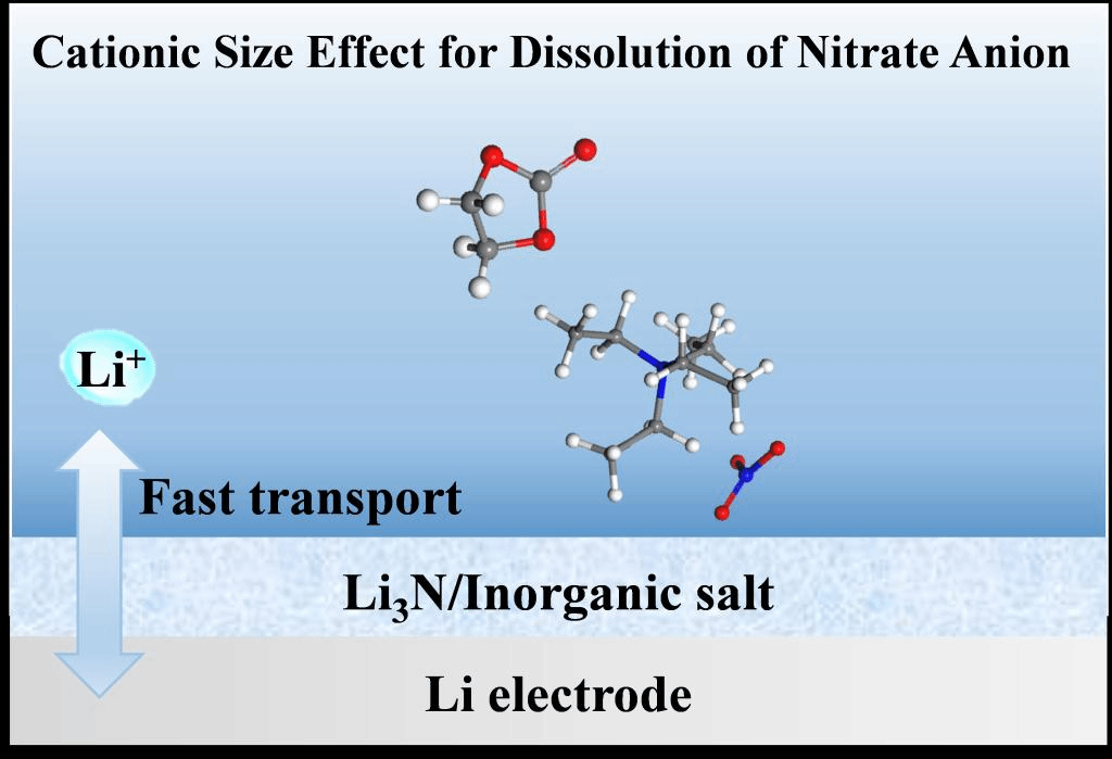 图1 利用“阳离子尺寸效应”溶解NO3-阴离子并在Li电极上形成含Li3N高离子电导率的SEI层示意图。