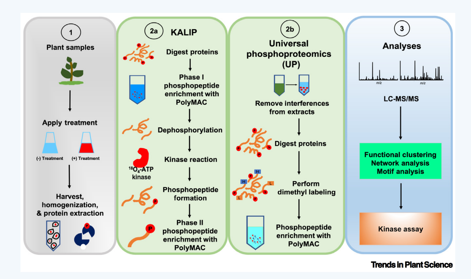 植物响应逆境胁迫的一个关键的机制是通过对重要蛋白的转录后修饰,尤其是蛋白磷酸化/去磷酸化,从而激活下游的抗逆反应。ABA信号转导通路中的蛋白激酶和底物的磷酸化和去磷酸化修饰是植物中非常具有代表性的范例。近十多年来,随着磷酸化蛋白质组学技术的发展和不断改进,ABA信号通路和渗透胁迫应答的早期蛋白磷酸化反应被成功地发现。然而,现有的磷酸化蛋白质组学技术仍然存在许多不足(如忽略了蛋白构象和丰度的变化),限制了更多植物逆境应答关键组分的鉴定和发现。本技术综述系统总结了近十多年的主要磷酸化蛋白组学技术,尤其是Kinase Assay Linked Phosphoproteomics (KALIP)和Universal Phosphoproteomics (UP)在植物逆境研究中的实验流程以及优缺点;并且还介绍了近年来发展起来的新型蛋白质组学技术limited proteolysis-mass spectrometry(LiP-MS),总结了其技术流程并展望了LiP-MS在植物逆境研究的应用前景。