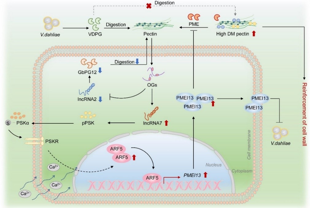 该研究揭示了长链非编码RNA通过编码小肽和生长素途径调节细胞壁防御基因从而调控黄萎病抗性的分子机制,为棉花抗黄萎病育种提供了一种新的策略和路径,对棉花和作物抗病品种的培育和农业绿色可持续发展具有重要的意义。