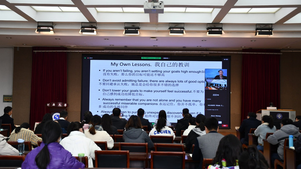 美国宾州州立东斯特劳斯堡州立大学终身教授、原河南大学美国校友会会长胡世雄博士;就职纽约联合国总部、原河南大学美国校友会会长翟莹女士;现任河南大学美国校友会会长、纽约龙峰文化基金会主席贾新峰等海外校友、专家学者,我校教育学部、哲学与公共管理学院、外语学院、化学化工学院、国际教育学院等校内专家学者、师生代表在教育学部一楼报告厅集中聆听了本次讲座。南开大学等国内相关专家学者也通过线上方式参加了报告会。报告会由河南大学教育学部副部长、教育学院院长王振存教授主持。
