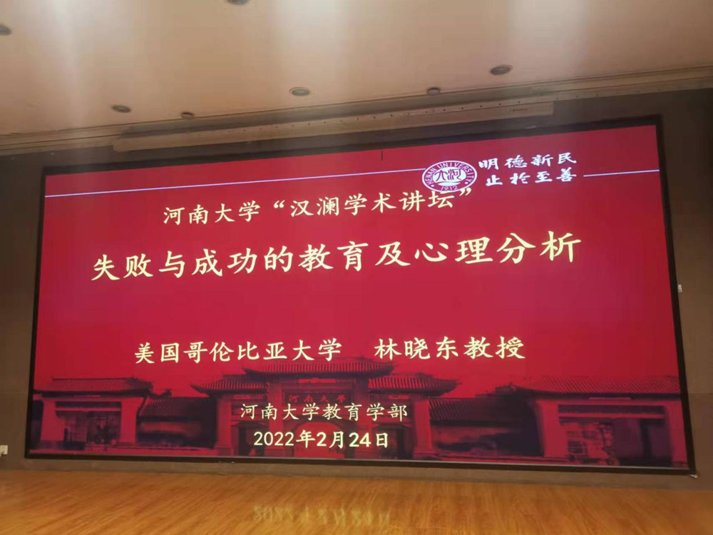 2月24日,作为河南大学110周年校庆活动内容之一,美国哥伦比亚大学终身教授、耐挫与创新教育国际联合研究中心主任、世界经济合作与发展组织咨询委员会首席教育专家林晓东教授应我校教育学部邀请做客“河南大学汉澜学术讲坛”,并作了题为《失败与成功的教育及心理分析》的学术报告,报告会通过线上线下结合的方式进行。