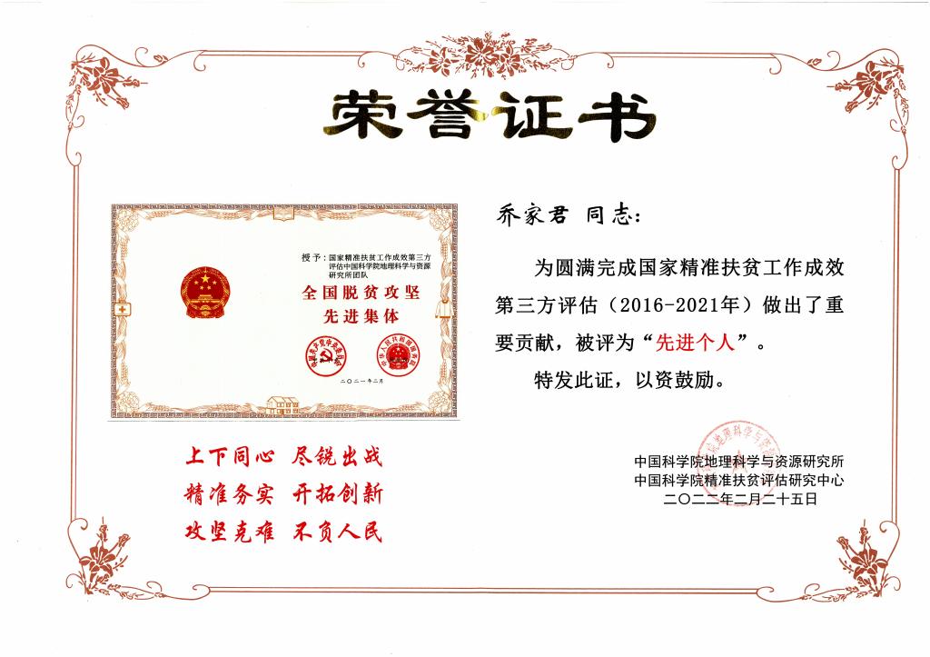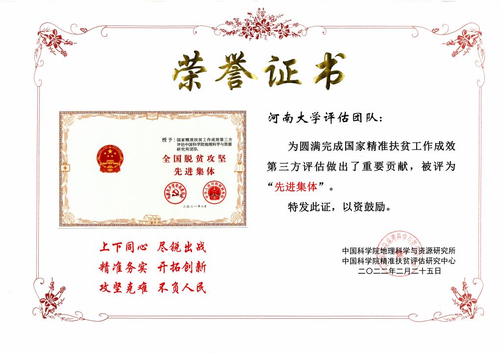 由刘彦随院士牵头的中科院地理科学与资源研究所评估团队被中共中央、国务院授予全国脱贫攻坚先进集体,河南大学评估团队是其中的一支重要力量,在国家精准扶贫工作成效第三方评估过程中作出了重要贡献。评估团队先后完成了河南、河北、山西、陕西、江西、甘肃等省份126个县2431个村的调研任务,深入访谈农户81901家,座谈各级干部4024人,完成问卷85925份,形成27个调研主报告,以及99个县市区的反馈报告,总字数达600多万字,为政府决策提供了强有力的科学支撑。评估团队还向有关政府部门提交了评估报告,梳理和总结了各县的典型案例及工作经验,并结合专业理论准确评估县脱贫攻坚工作中存在的问题,提出科学、合理、可操作的政策建议。鉴于河南大学评估团队的突出贡献,在中国科学院地理科学与资源研究所召开的表彰大会上,河南大学评估团队被评为“先进集体”并授予荣誉证书。河南大学评估团队负责人乔家君教授及团队主要成员韩冬、程利莎,在评估工作中秉持客观公正、科学独立的核心价值,扎实开展评估调查,高质量完成了各项任务,被评为“先进个人”并授予荣誉证书。