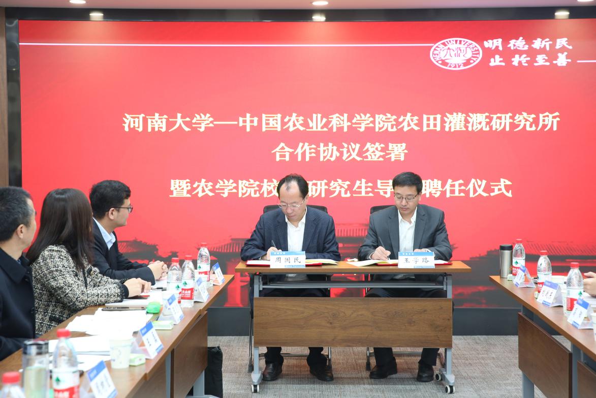 3月9日下午,我校与中国农业科学院农田灌溉研究所合作协议签署暨农学院校外研究生导师聘任仪式在国家重点实验室一楼会议室举行。灌溉研究所所长周国民、副所长齐学斌、副校长王学路出席仪式。灌溉所相关领导和学术骨干,学校研究生院、科学技术研究院、棉花生物学国家重点实验室、省部共建作物逆境适应与改良国家重点实验室、农学院相关负责人和学术骨干参加签约仪式,仪式由农学院党委书记王磊主持。